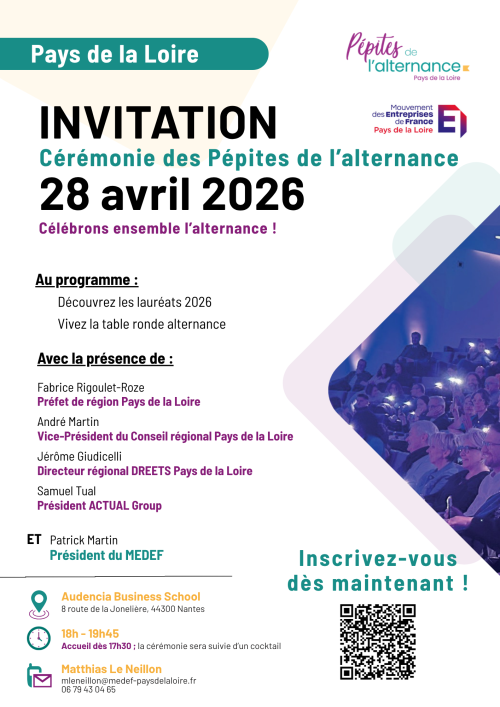 Le concours organisé par le MEDEF Pays de la Loire pour repérer, récompenser et valoriser les entreprises qui font de l'alternance une véritable réussite.